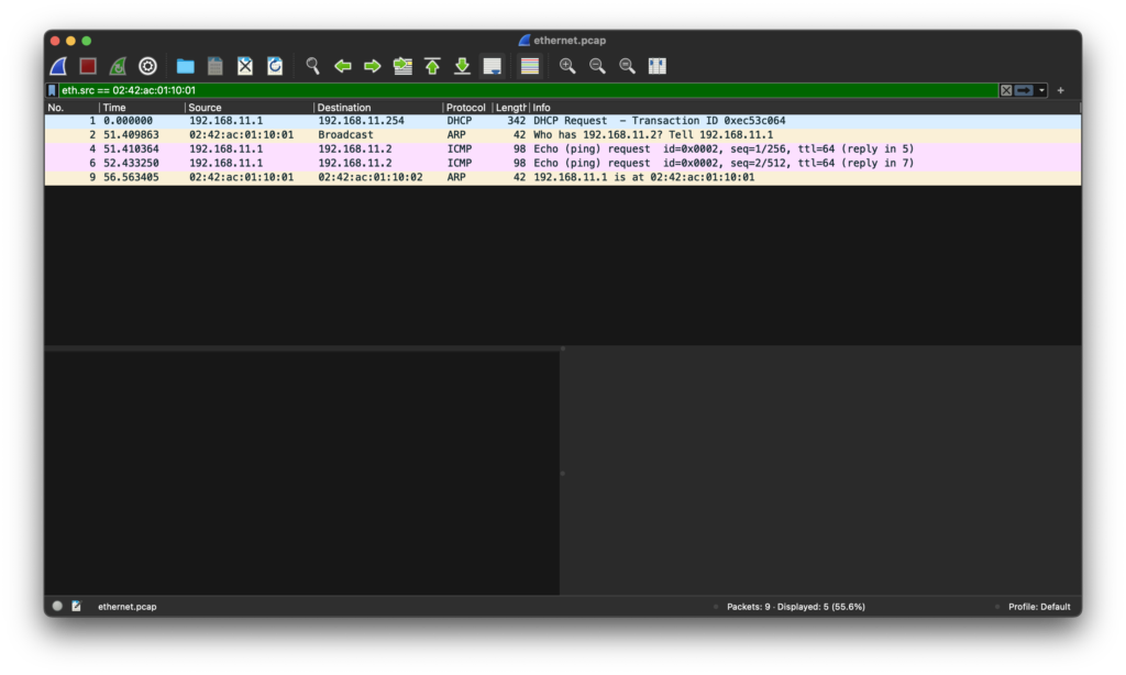 フィルターで、eth.src == 02:42:ac:01:10:01 と入力